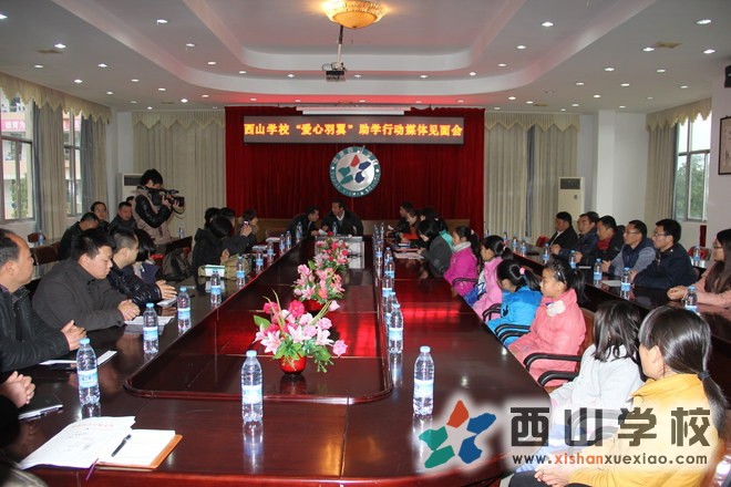 2014年3月7日上午,福州电视台、福州日报、新浪网、凤凰网、海都网、东南网等新闻媒体记者来福建西山学校看望“爱心羽翼”受助的学生,关注他们现在西山学校学习和生活状况。下午4点,福建西山学校在科技楼第一会议室召开“爱心羽翼”助学行动媒体见面会。福州电视台、福州日报、新浪网、凤凰网、海都网、东南网等新闻媒体记者,西山教育集团董事长兼总校长张文彬,总校常务校长林峰,总校副校长喻勇、乐清华、仇昌乐,总校各部门各处室的领导,受助学生和家长,受助学生班主任参加了此次见面会。